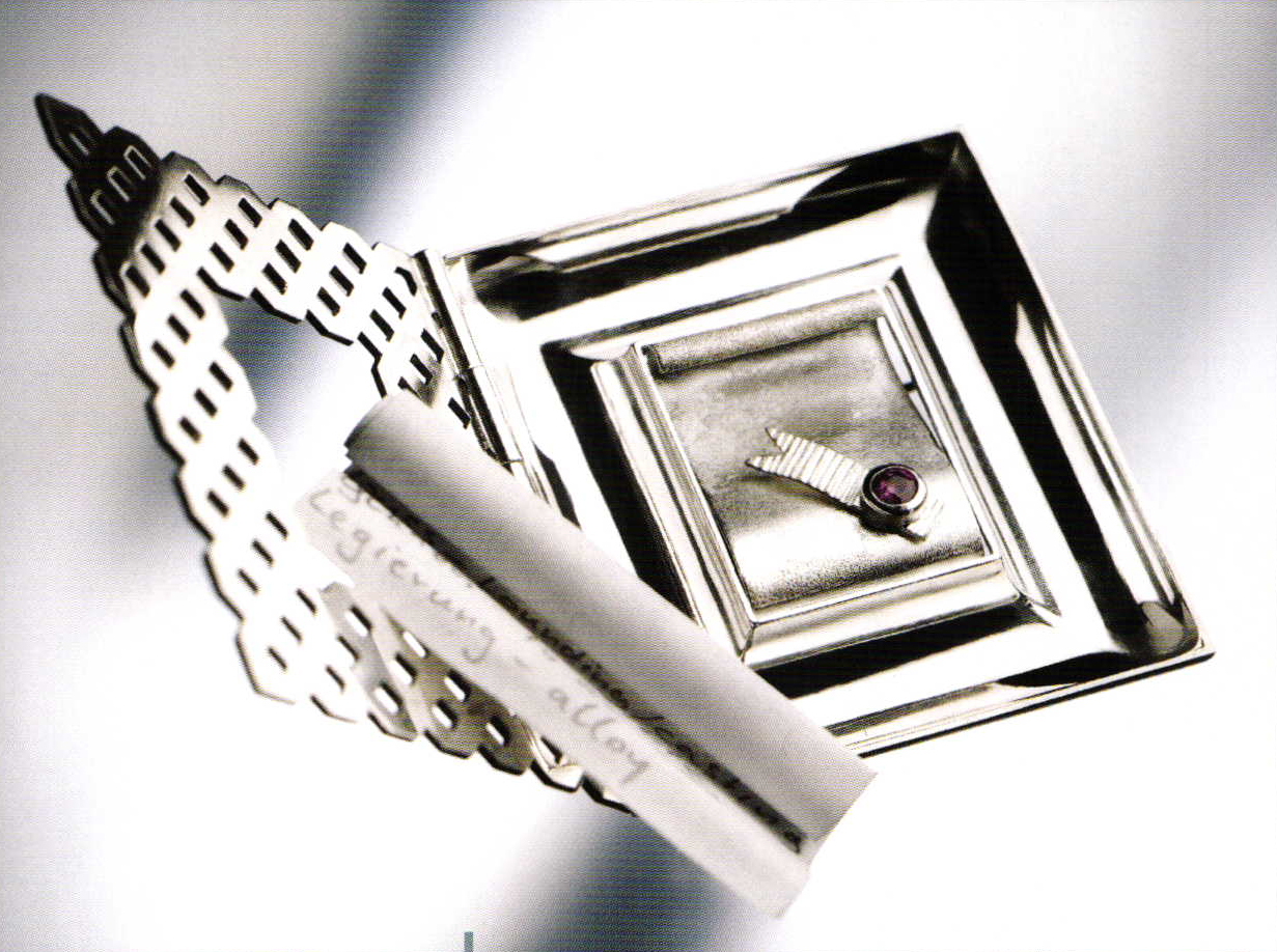 The competition is named after the Italian Renaissance goldsmith and sculptor Benvenuto Cellini (1500-1571), who was a headstrong and revolutionary figure of his time. Overall, 52 budding young goldsmiths, silversmiths and jewelry designers submitted their work. Provided with 50 grams of sterling silver, sponsored by the Allgemeine Goldund Silberscheideanstalt Pforzheim, they went to work. Six winning pieces were then selected in September by a panel of experts at the Ruhle-Diebener-Verlag publishers in Stuttgart. Each winner received a prize of 1,000 euros, donated by the ZV, the GZ, the Inhorgenta Europe and the Jewellery Relation Group (JRG).