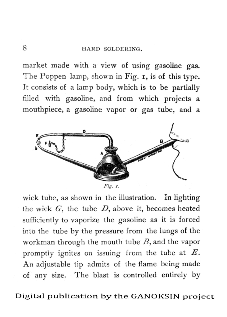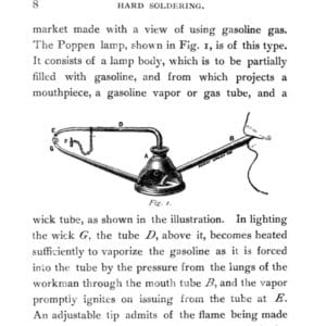 There are a number of mouth driven blowpipe torches described using various fuels. Alcohol and gasoline are recommended. Gasoline torches of various kinds are described with very clear engraved illustrations. (Gasoline torches are still standard in many tropical countries mostly ones with open sides to their workshops lots of air blowing through). The beginnings of gas torches are shown, and it makes one realize how far we have come and at the same time lets you understand the principles behind today’s torches. Odd arrangements of tubes and heating systems for pre-heating the gasses are used to get the temperature high enough to melt platinum.