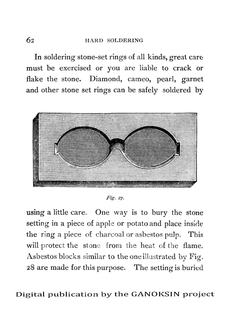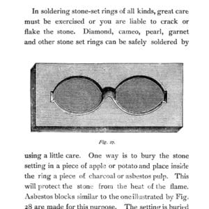 There is an excellent section on testing gold alloys for gold content. Using apples and potatoes to protect a gem during ring sizing is described. (I like paper towel and water mush for this myself). Repairs and joint types are covered.