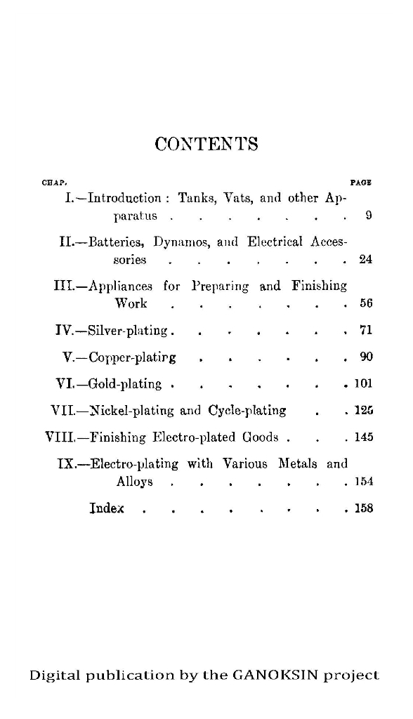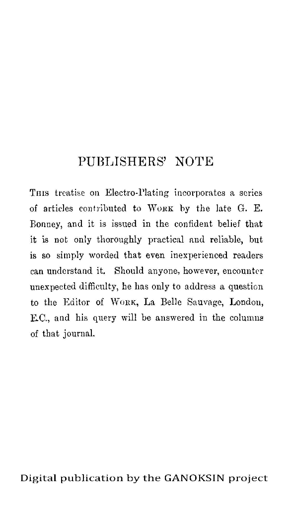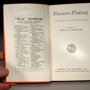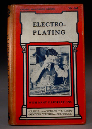 This rare book first published in 1905 gives a good explanation and introduction to electroplating, with extensive chapters on polishing and finishing work for plating. There are numerous recipes throughout the text and the writer’s ‘Voice’ is clear and readable.
