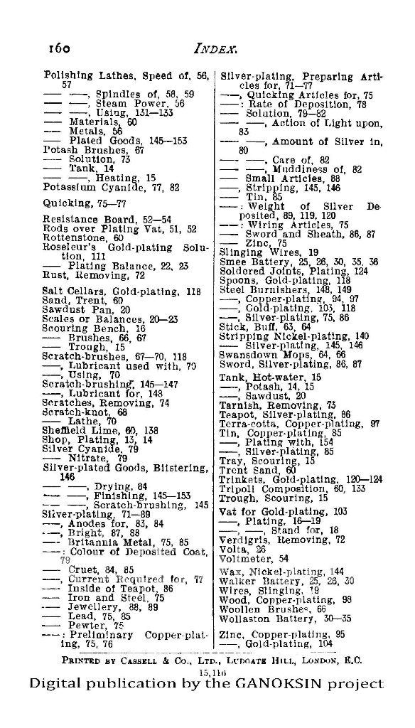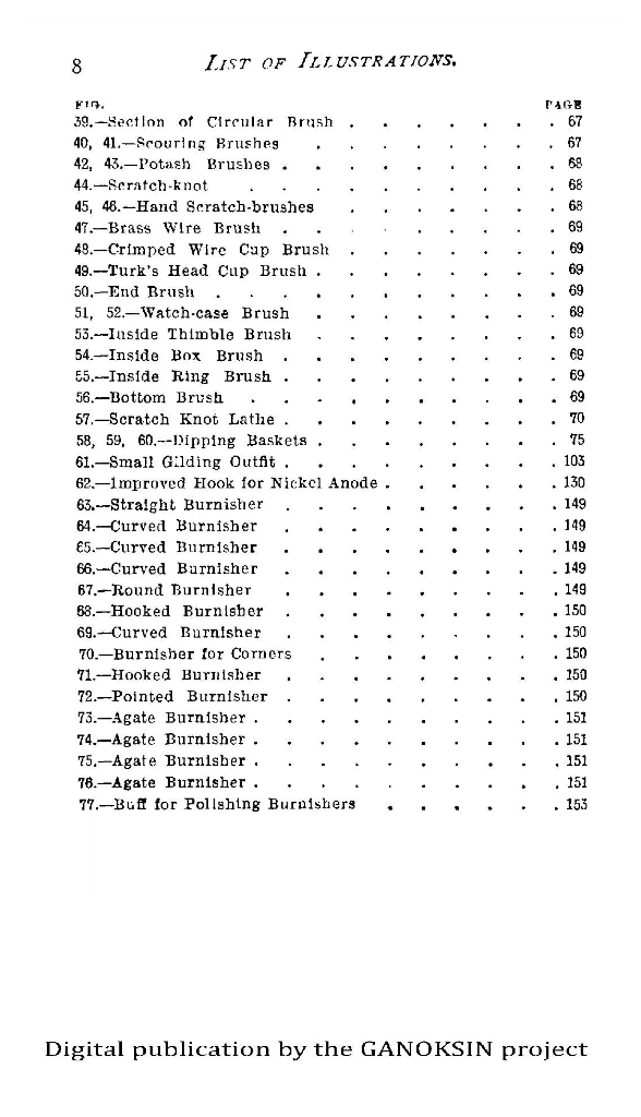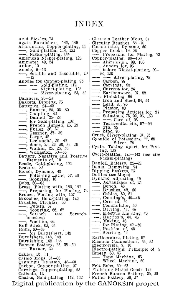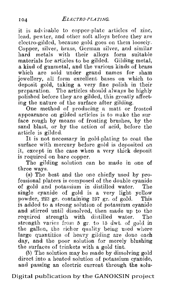 There are chapters on silver, gold, copper and nickel plating. Removing verdigris, rust and all manner of surface coatings is covered. Full (and truly dangerous) recipes are given for all the plating solutions. There are specific notes for all kinds of objects, such as bicycle parts, even preparing a sword for plating. It is clear that plating was an art rather than a science, with many reactions having visual clues to their progress. The text is completely filled with the ‘voice of experience’, and observations that hold true today in any plating practice. The details for each type of plating are exhaustive, and written in a narrative style that is easy to read. There are forgotten techniques as well, like using copper anodes when gold plating in order to plate rose gold. Brush plating, and dealing with problems like plating inside objects and on all sorts of metals are addressed. A section on finishing the plated works deals with all kinds of buffing and many steel and agate burnishers, some shapes I’ve never seen before.