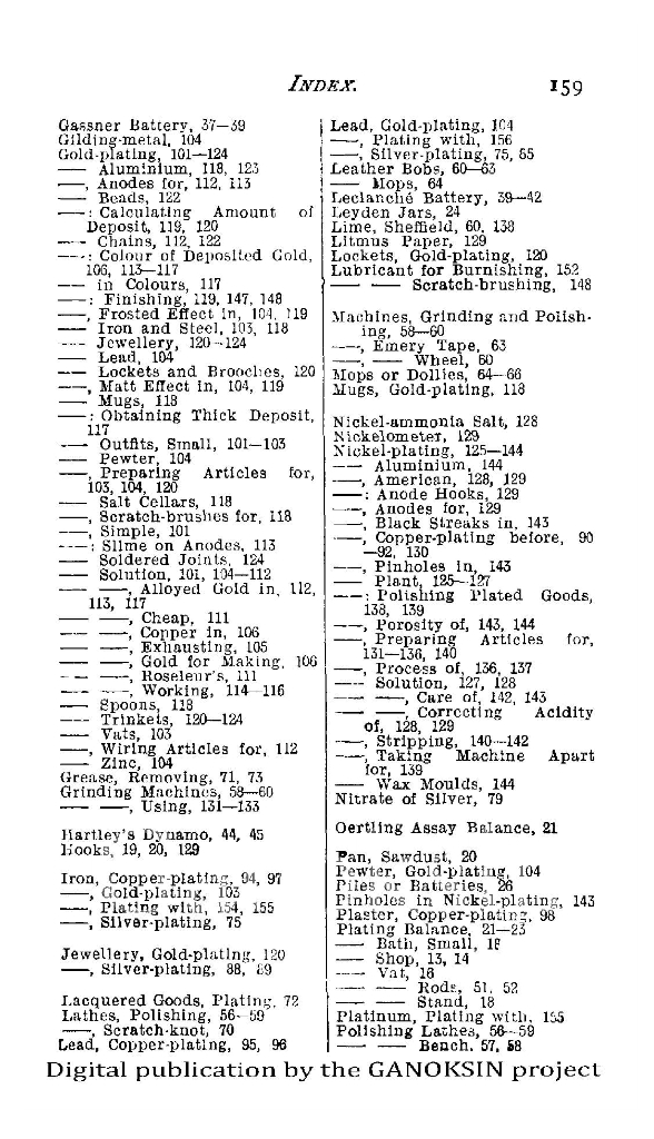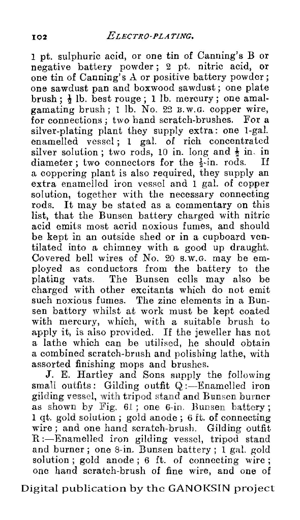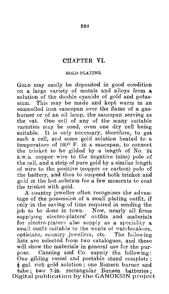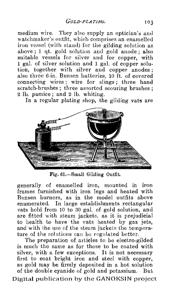 While the descriptions are aimed at an electroplating shop of the late 19th century the information can be scaled down for the small shop. All the tools and equipment for each procedure is described in detail. Along with large tanks the author explains making a small tank using glass plates in a wooden box cemented with gutta percha and pitch. An oddity is an engraving and description of a plating balance that lets you measure the weight of metal applied to plated articles.
