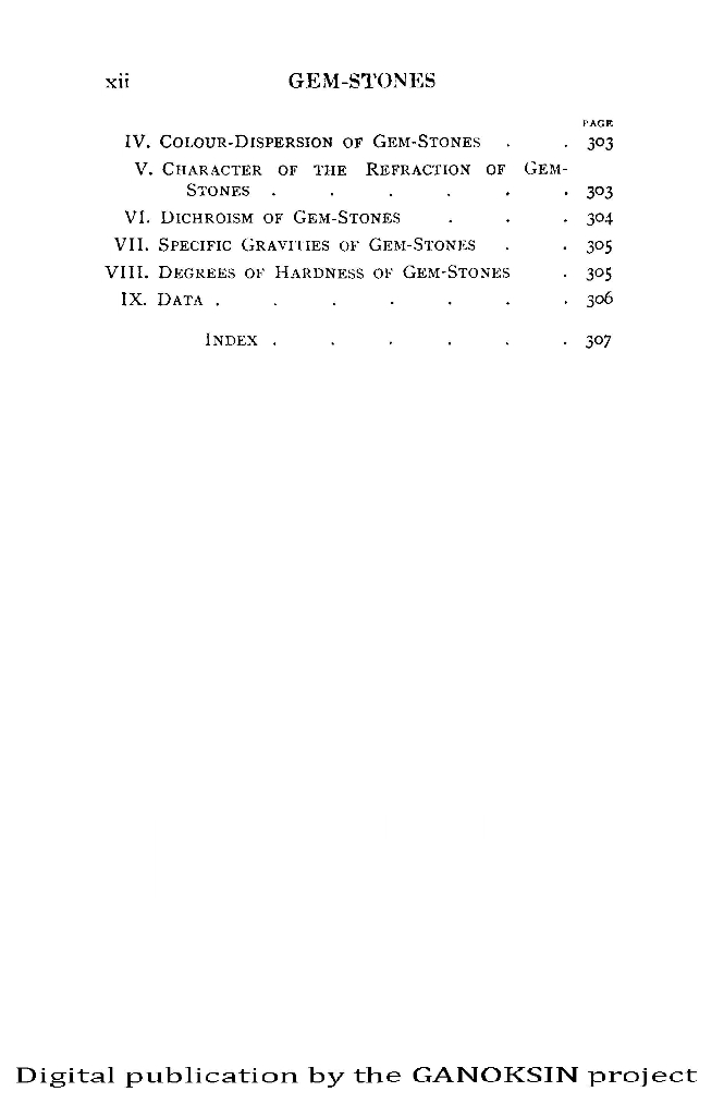Gems: color dispersion of gemstones, character of the refraction of gemstones, dichroism of gemstones, specific gravities of gemstones, degrees of hardness of gemstones, data.