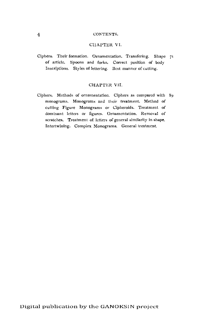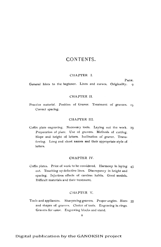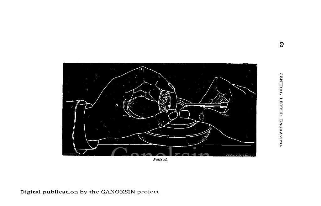 There is an extensive chapter on engraving coffin plates in different metals. Patience, repetition and the mastery of small components to build to excellent work is emphasized. The need for persistence, practice and more practice is tellingly repeated. Ring engraving is addressed in detail. Methods of recording engravings on paper are explained (no photocopiers back then). There are many very good illustrations, mostly engraved. Some are white lines on black ground, clearly printed from engraved plates.