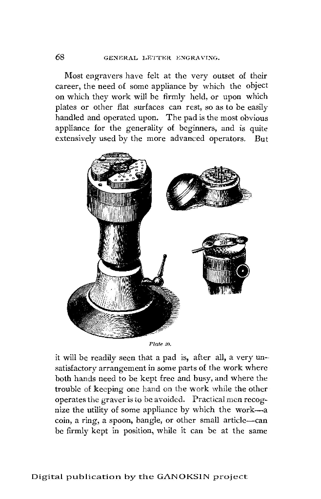 Door plates, and coffin plates are recommended as common engraved objects for the learner. An engravers pad (a hard cushion of leather) is used at the beginning. (interestingly identical to the way shown me by a Haida West Coast First Nations engraver). There is another version shown set on a rotating support. Good drawings on how to hold the graver help understand what is meant in the text.