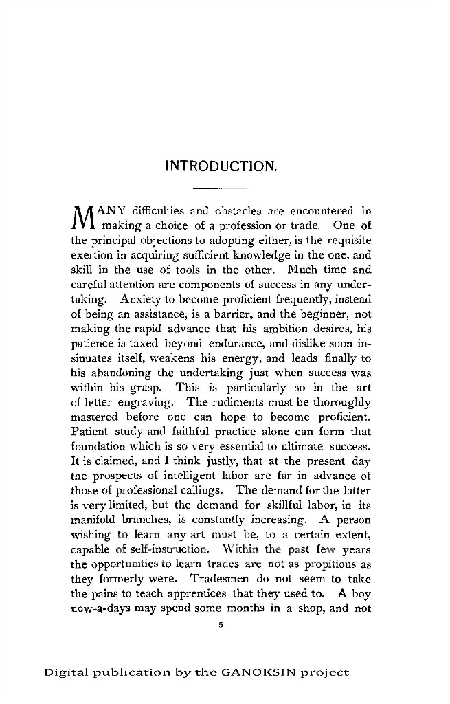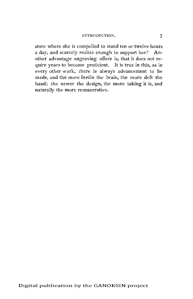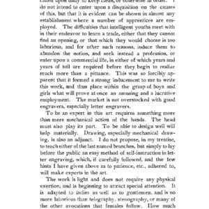 “thus place within the grasp of boys and girls what will prove at once an amusing and a lucrative employment. The market is not overstocked with good engravers, especially letter engravers.” And “The work is adapted to ladies as well as to gentlemen, and is no more laborious than telegraphy, stenography, or many of the other avocations that females follow. How much better would it be for a girl to be able to engrave well and earn a comfortable living, than to be employed in a store where she is compelled to stand ten or twelve hours a day, and scarcely realize enough to support her?”