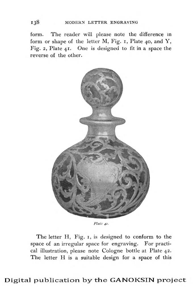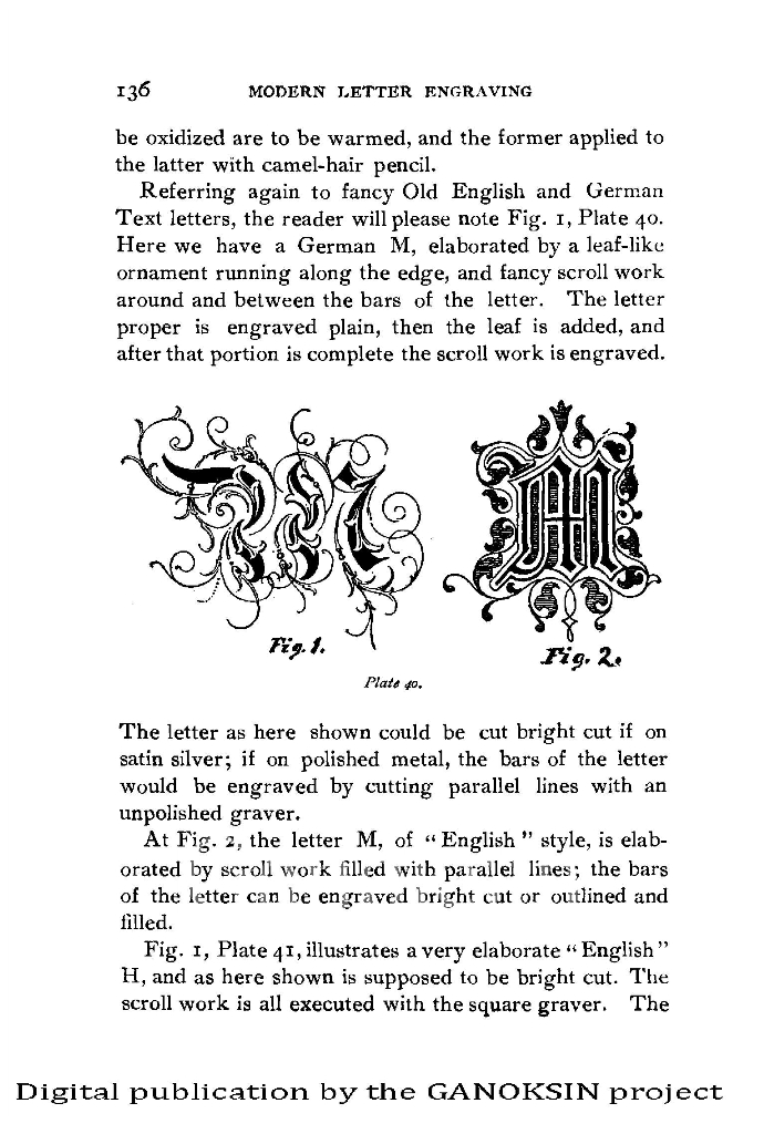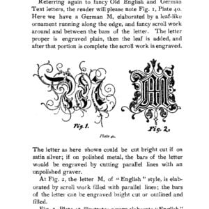 Monograms and their layout principles in varied spaces and their special engraving tools are shown, as are engraving balls. Block, Roman, Old English, German, Gothic, Ciphers, shaded letters, bright cut, flourishes. Ribbon work, and other kinds of lettering are covered. Patinas are described as well, darkening silver to obtain contrast with the lettering.