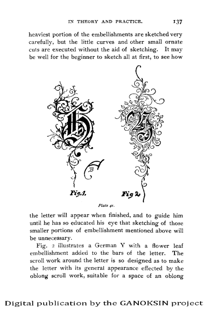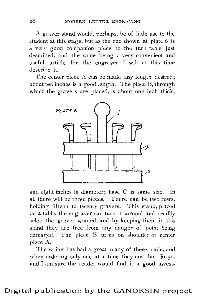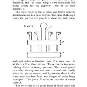 Information on design and layout is addressed, using dilute china white to thin coat the surface for layout (or wiping your index finger through your hair and then patting the resultant oil onto the metal surface). Practice plates and designs for practicing and learning are illustrated. The ‘line of beauty’ is described and its core use in lettering explained: it is used in 20 out of 26 script letters. Also addressed are the principles of the ‘capital stem and body stroke’; The author describes a turntable of his own design to allow finished silver vessels as well as flat plates to be engraved. A precursor of the engravers ball used today. This tool reduces scratches on the object during engraving.