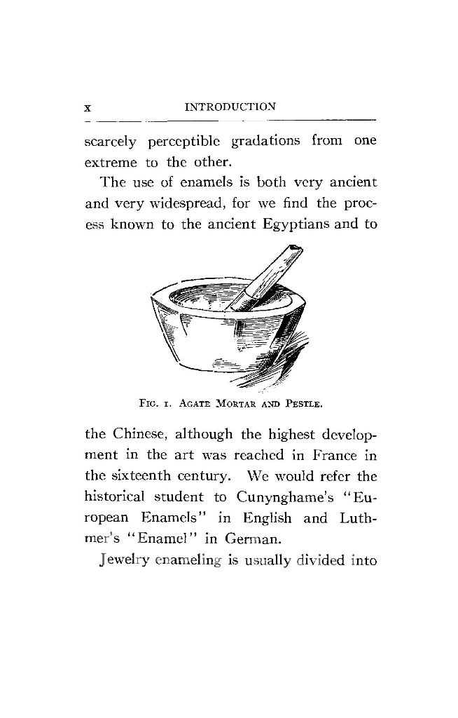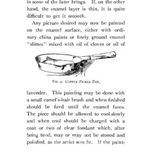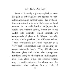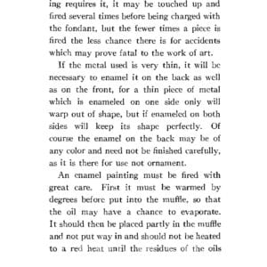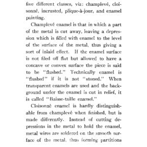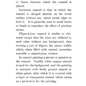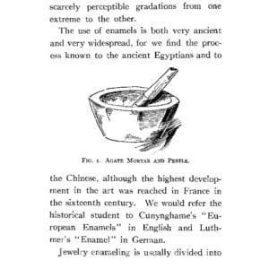 This 1911 book is a great introduction to enameling, and discussion of definitions and techniques of various kinds of enameling. There is insight into how enamels were prepared and delivered, as chunks or large ‘plates’ that the enamellist broke up and ground for use. This is really gritty, authentic enameling preparation, with all the hand grinding information one would ever want to know.