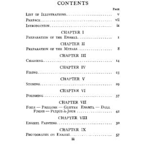 Chapters include: Enamel preparation, metals preparation, charging enamel, firing, stoning, polishing, foils, using paillons, glitter enamel, matt finishes, Plique-a-jour, enamel painting, decal use, and creating photographs on enameled surfaces.