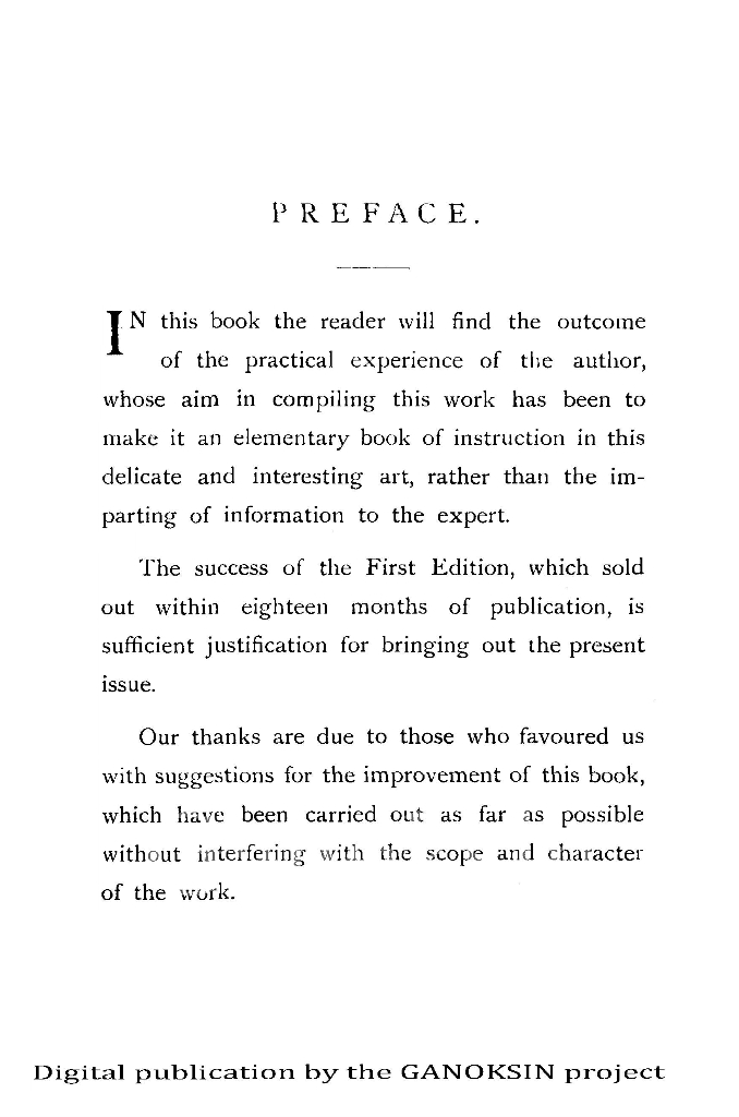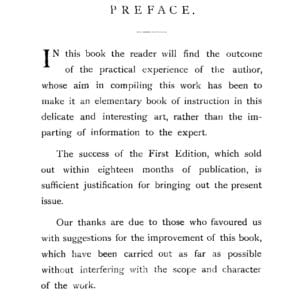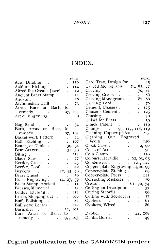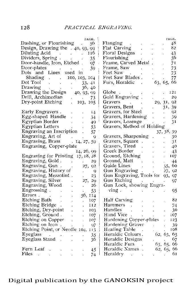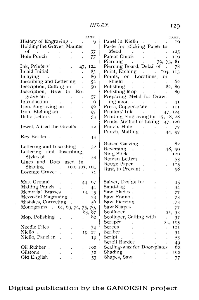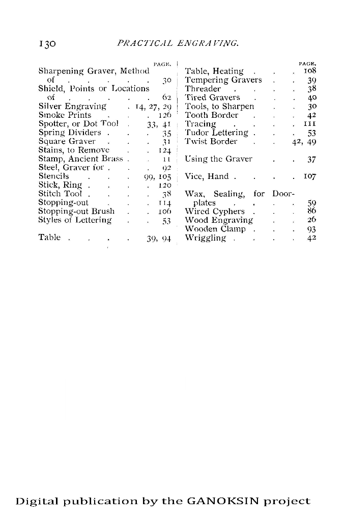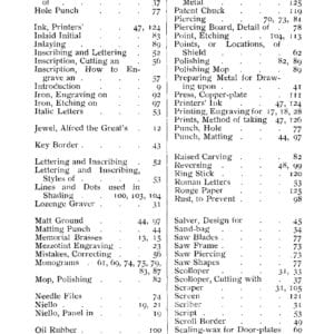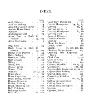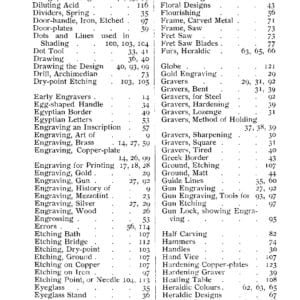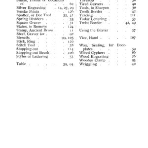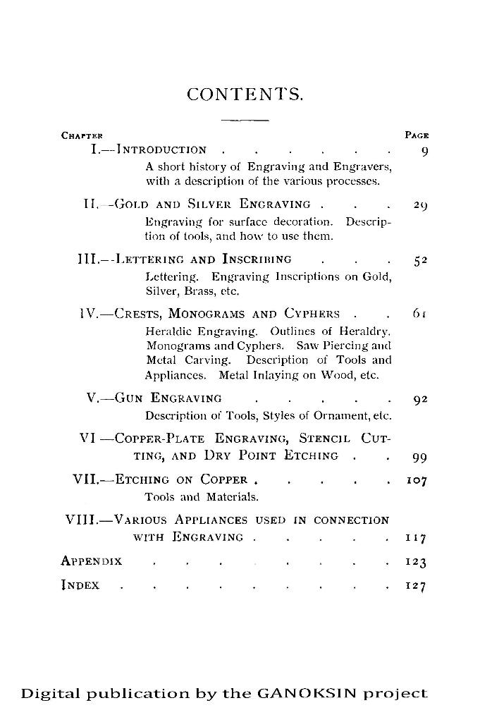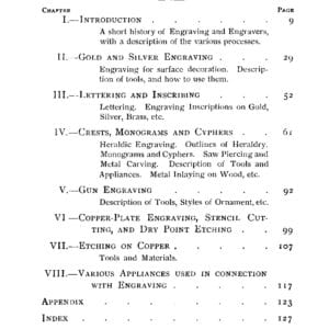 The main chapters after the introduction include Gold and Silver Engraving, Crests, Monograms and Cyphers, Gun engraving, Copper Plate Engraving, Stencil Cutting and Dry Point Etching, Etching on Copper, Various appliances used in Connection with Engraving. Lots of detail on tools and using them throughout.