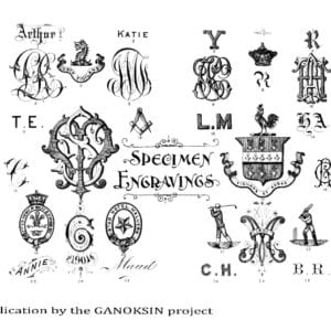 copper-plate, Old English, and Gothic. Spacing, layout, tools, flourishes, repairing mistakes and stroke directions are described. The use of chisels for carving brass is diagrammed, and the engraved out letters and shapes were filled with niello, or colored sealing waxes.
