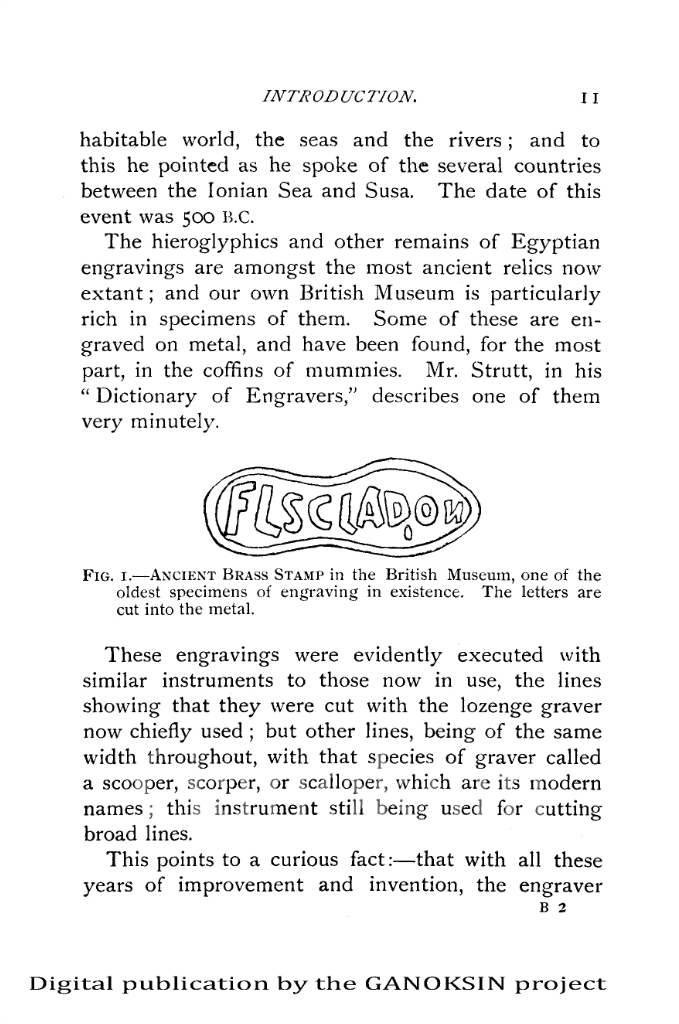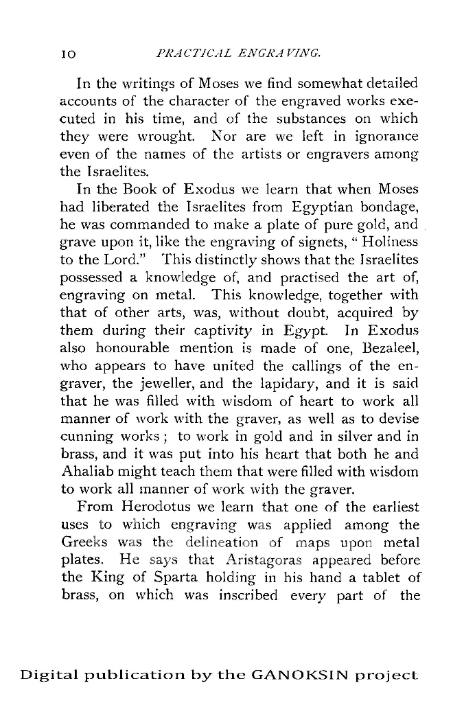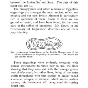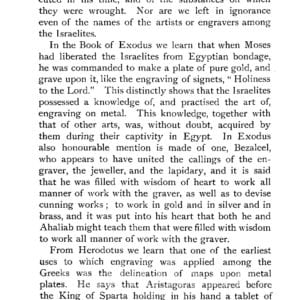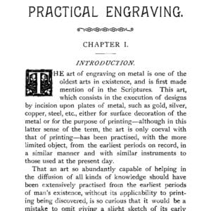 The 1899, 117 page book is intended for the amateur, the learner. As with many books of this time it begins with a history, placing engraving in a context, and the Old Testament, proving the ancient origins of the technique and its uses. Egypt is addressed. Then leaps into medieval times. Grave brasses are extensively discussed. Picture engraving for books, printmaking (1423) as well. As niello workers are credited with the development of printing plates there are detail of how niello is made and used by goldsmiths. Printmaking history is addressed in terms of different ways working printing plates, mezzotint and more. Steel engraving and gun engraving is discussed.