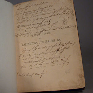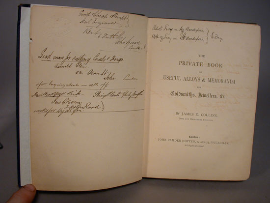 This 1871 book was compiled from the in-house notes of “one of the largest and most eminent Manufacturing Goldsmiths and Jewellers in this country” which had gone out of business, thus freeing Mr. Collins to reveal the companie’s secrets and experience. Much of the book is alloy recipes for all different purposes, such as enameling gold alloys, gold for making pens, gold and silver solders. There are sections on refining, on ‘coloring’ the gold (depletion gilding). There are 96 pages of alloying and trade secret information, and 36 pages of intriguing advertisements for books being published in 1872.