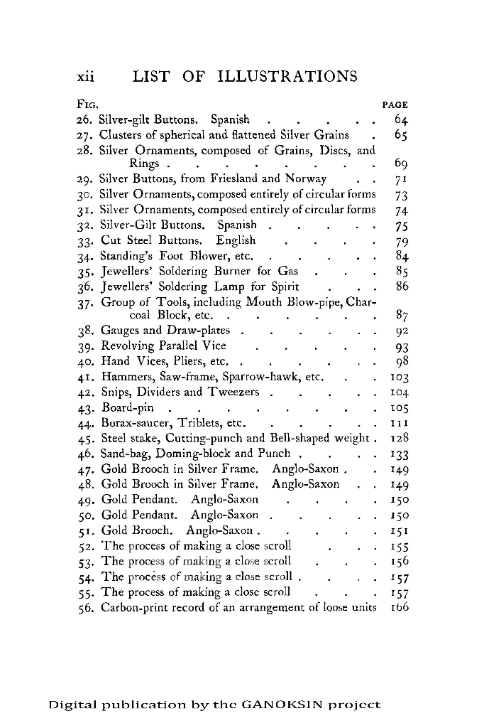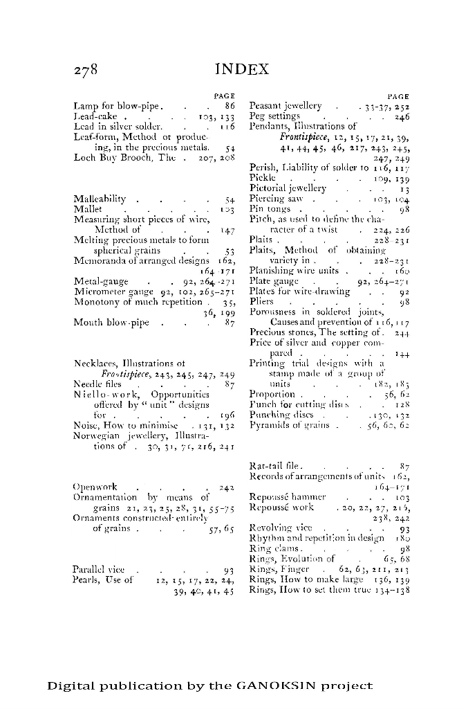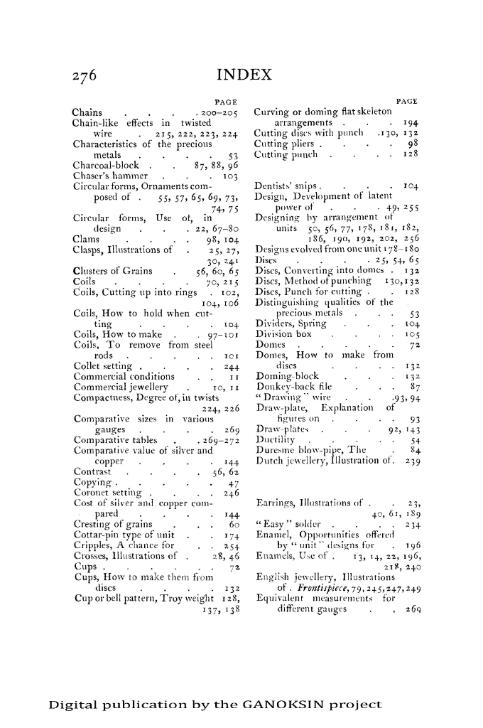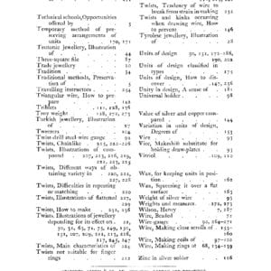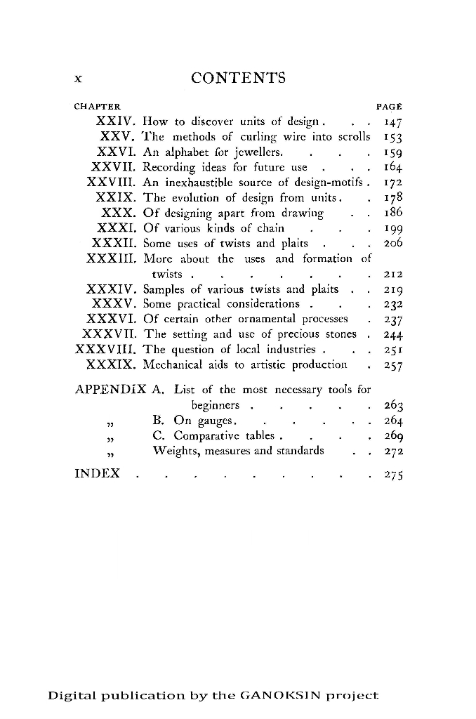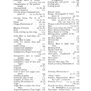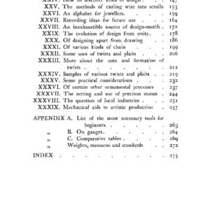 Uses and action of the blowpipe, wire drawing and annealing, coiling wire for making rings and grains, processes of soldering and pickling, details about soldering, constructive functions of grain clusters, devices for making clusters of grains, making and using discs and domes, details about making wire rings, drawing flat wire, how to discover units of design, methods of curling wire into scrolls, an alphabet for jewelers, recording ideas for future use, an inexhaustible source of design motifs, the evolution of design from units, of designing apart from drawing, various kinds of chain, some uses of twists and plaits, more on the uses and formation of twists, samples of twists and plaits, some practical considerations, other ornamental processes, setting and use of precious stones, the question of local industries, mechanical aids to artistic production.