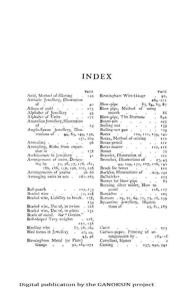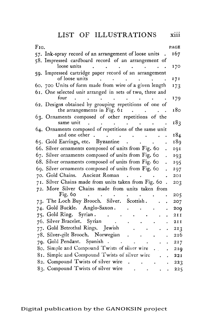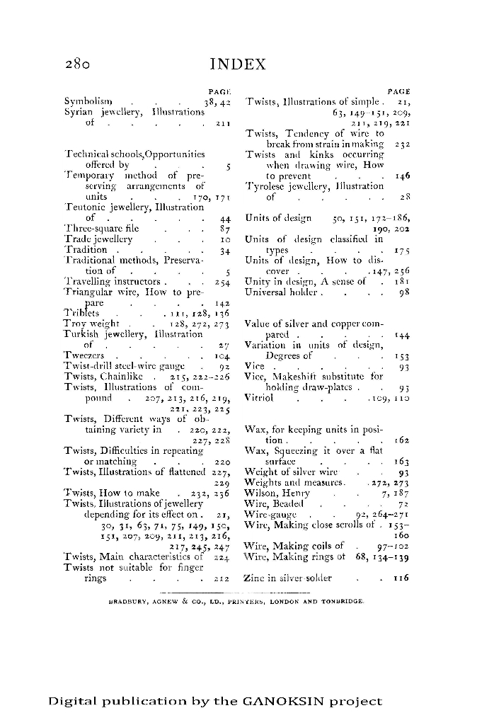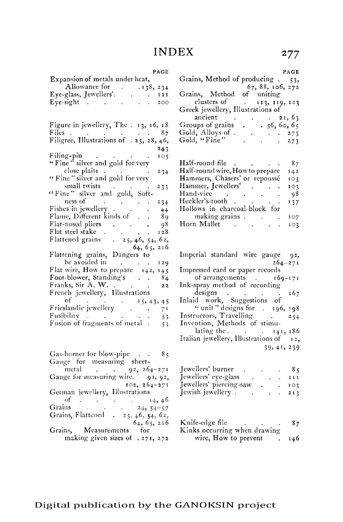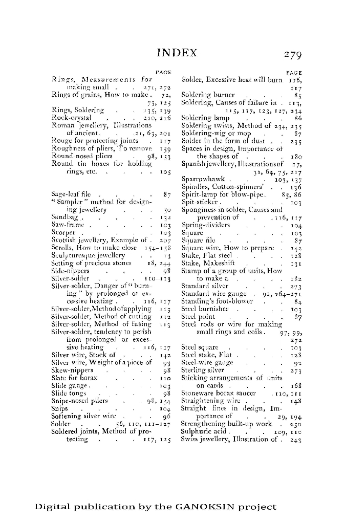 Uses and action of the blowpipe, wire drawing and annealing, coiling wire for making rings and grains, processes of soldering and pickling, details about soldering, constructive functions of grain clusters, devices for making clusters of grains, making and using discs and domes, details about making wire rings, drawing flat wire, how to discover units of design, methods of curling wire into scrolls, an alphabet for jewelers, recording ideas for future use, an inexhaustible source of design motifs, the evolution of design from units, of designing apart from drawing, various kinds of chain, some uses of twists and plaits, more on the uses and formation of twists, samples of twists and plaits, some practical considerations, other ornamental processes, setting and use of precious stones, the question of local industries, mechanical aids to artistic production.