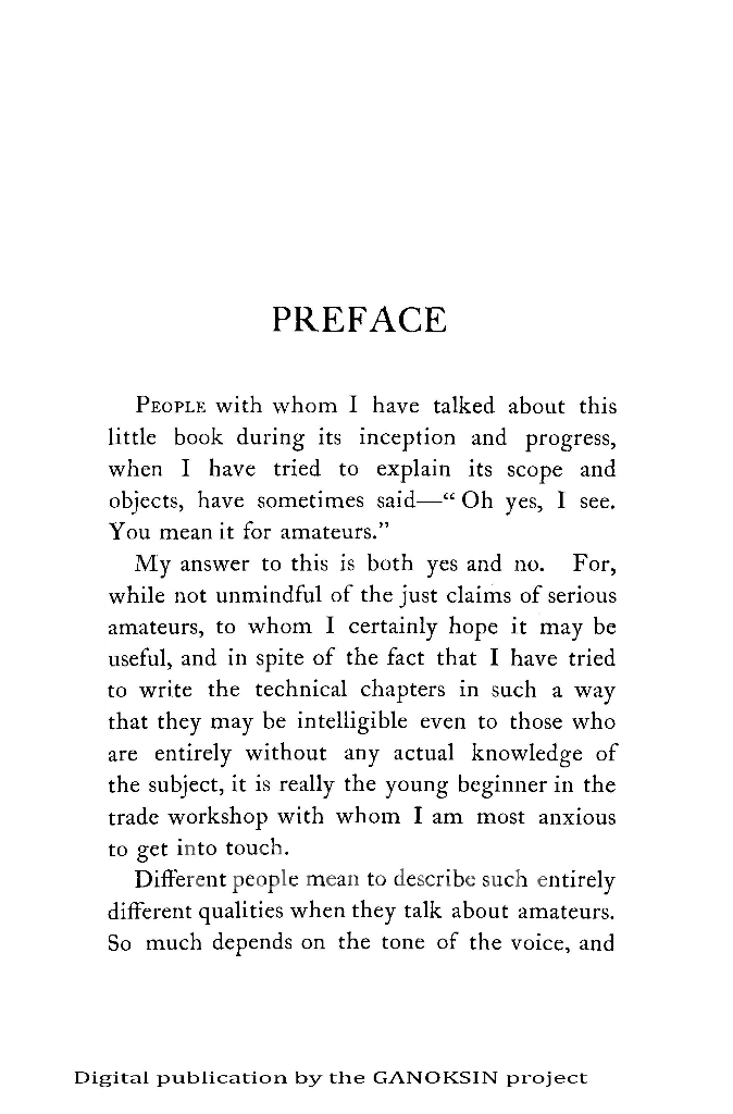 “The growth of commercialism, moreover, has robbed us of much of our due inheritance in these matters, and in many crafts it has certainly undermined, if it has not absolutely swept away, the whole fabric of apprenticeship. However, it has given us fresh opportunities in exchange, and has imposed new conditions. If it has made it difficult for a youth to obtain a thorough allround training in a manufacturer’s workshop, it has at least done something towards removing the barriers which formerly preserved the mysteries of each craft as impenetrable secrets, only to be revealed to those who were bound by indentures to serve through a long term of years at merely nominal wages.”