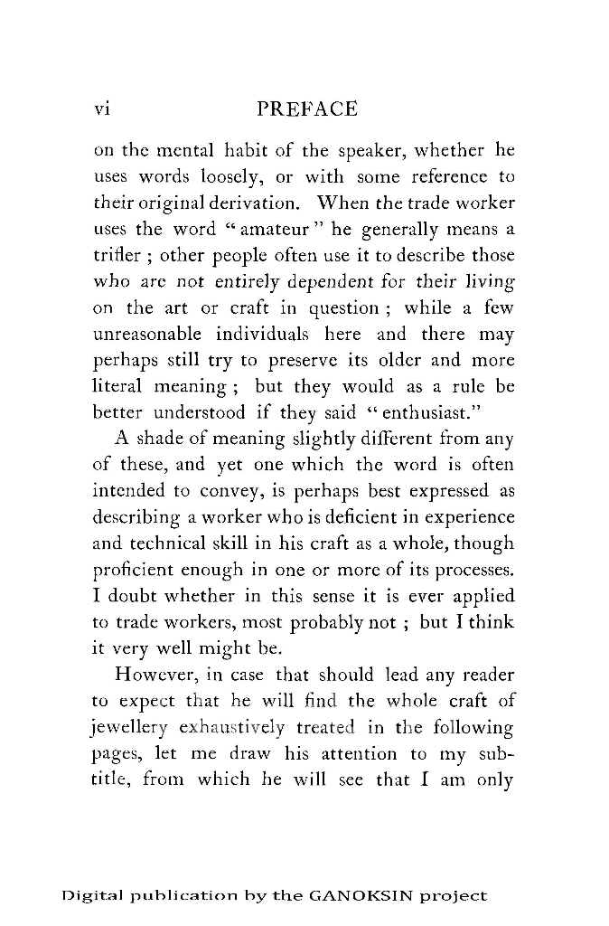 The book starts with a discussion about education and how to learn jewelry making. At the time the author bemoans the lack of schools for jewelry making, that mostly it was through the job, or haphazard in hobbyist and amateur training. This book is written at the very beginnings of jewelry and metals being introduced into the educational system.
