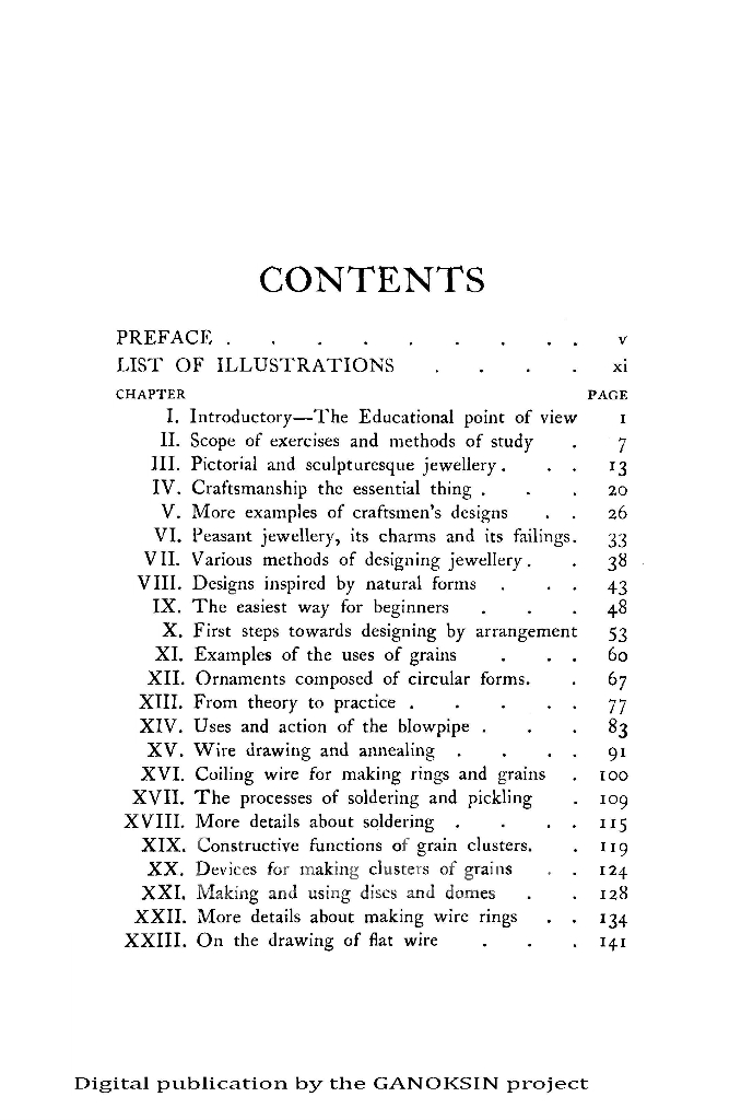 The educational point of view, scope of exercises and methods of study, pictorial and sculpturesque jewellery, craftsmanship, examples of craftsmen’s designs, peasant jewelry, designing jewelry, designs inspired by natural forms, the easiest way for beginners, designing by arrangement, the uses of grains, circular forms, theory to practice.