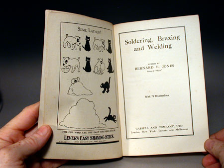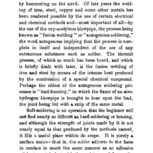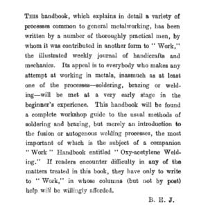 This 1916 book (republished in 1921) teaches the core skills of soft and hard soldering (brazing) and introduces basic principles of welding metals. It is a book derived from many articles by different authors in the magazine ‘Work’, an illustrated weekly of the time. Oxy-acetylene was a new process at this time and this kind of brazing with brass, and welding metals other than steel were new possibilities for metal workers.