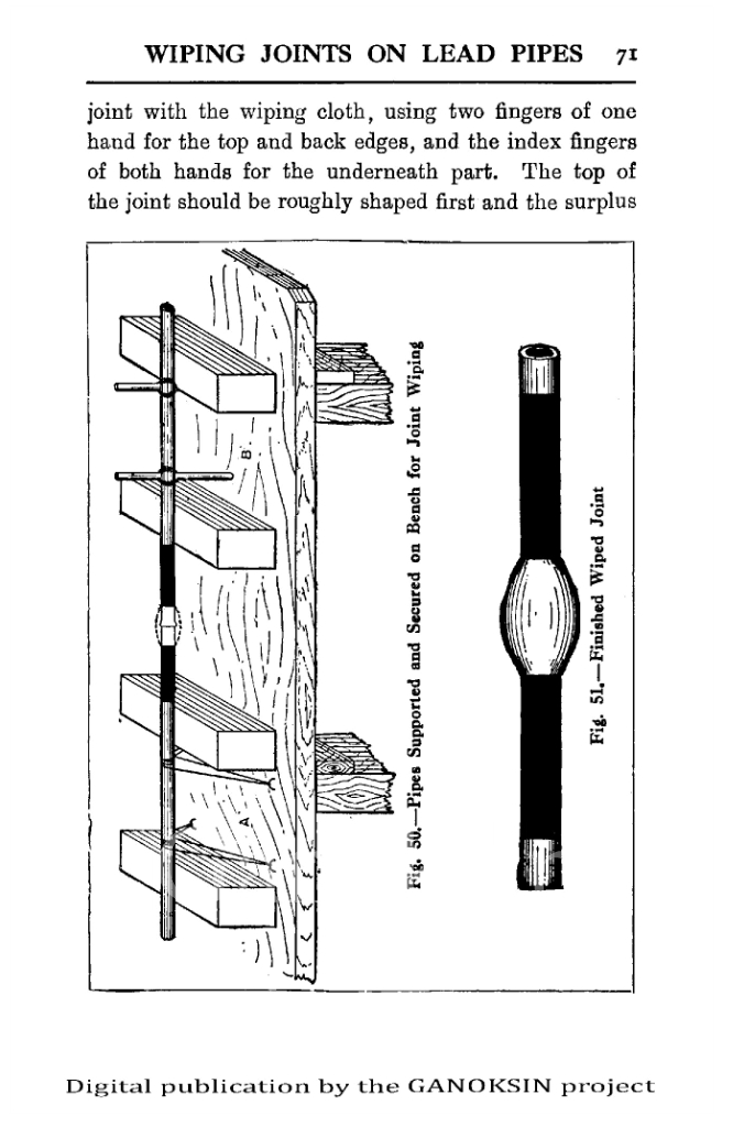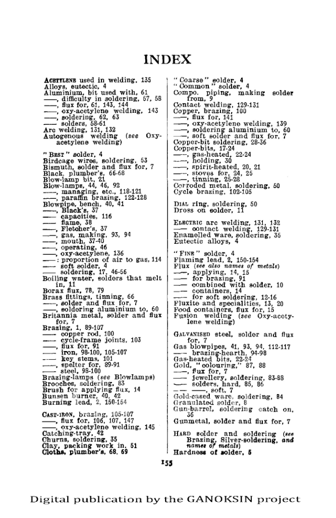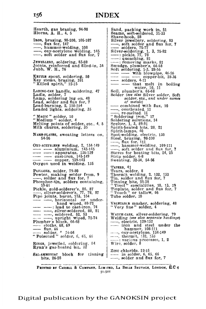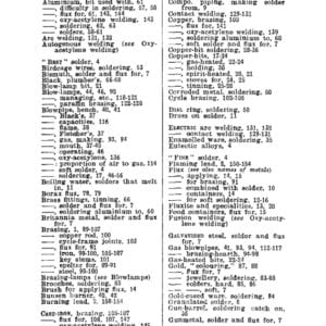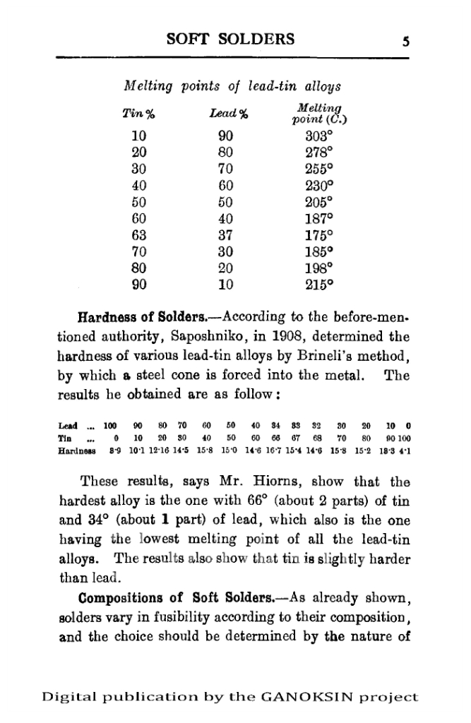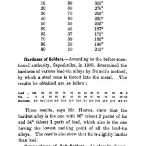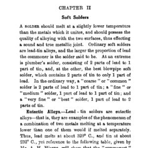 There are for example recipes for lead/tin solder for aluminum and other oddities as well as fluxes for different metals. There are some odd terms, “Killed Spirit” for instance is called zinc chloride today. And ‘rottenstone’ is what we call Tripoli. Methods of using paper cones to pour solder into water to make wire are described. There are a number of solder recipes that melt in boiling water. There are some very interesting and complex soldering iron shapes for soft soldering work. Tinning methods are dealt with. Aluminum soldering and solder recipes are covered.