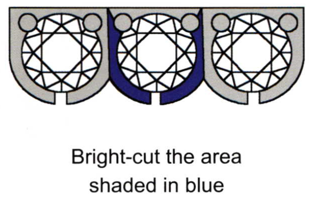 You can at this juncture of this procedure, bright-cut from the top ofthe bead and swing down to the bottom of the semi-circle. Also try and bright-cut the metal between the beads; if you can't, at least keep the beads separated, as it will look more professional. A thinned out #39 flat graver suits the bill in bright-cutting the full semi-circle cut. You should use only one run of cutting. Why? The result is one continuous flow of metal with no faceting in its appearance. Start at the very top of the bead and swing right into the bottom of the bottomed opening - ONE LONG DELIBERATE CUT! This is one of the more delicate final steps necessary in the finish of a fish-tail setting.